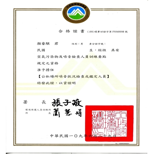 公私場所噪音狀況檢查或鑑定人員合格證書