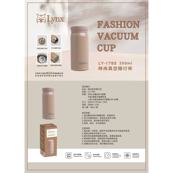 【Lynx】時尚真空隨行杯200ml LY-1793產品說明