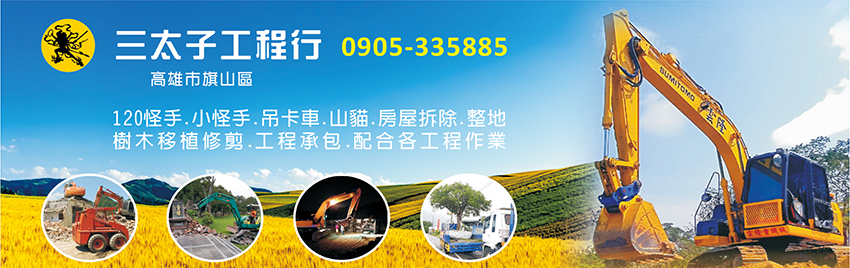 三太子工程行是高雄地區專業的工程公司,數十年以上經驗,專營專業120怪手、小怪手、吊卡車、山貓、工程承包、房屋拆除、樹木移植、樹木修剪、整地、配合各工程作業...等。