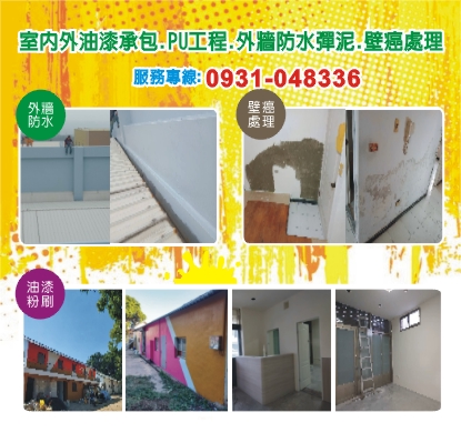 室內油漆、PU防水施作、壁癌處理、外牆防水彈泥、室內粉刷、民宅粉刷、店面噴漆、裝潢油漆、油漆工程承包、傢俱烤漆、鐵件烤漆、門板烤漆、陽台油漆、外牆油漆、牆面油漆、圍牆油漆、天花板油漆、房屋新建油漆、新房油漆、房屋油漆、套房油漆、豪宅油漆、樓梯油漆、裝潢場油漆、營造場油漆、居家油漆、各式油漆工程、台中油漆、台中室內外油漆粉刷、台中PU防水施作、台中頂樓防水、台中外牆防水、台中外牆油漆、台中外牆防水彈泥