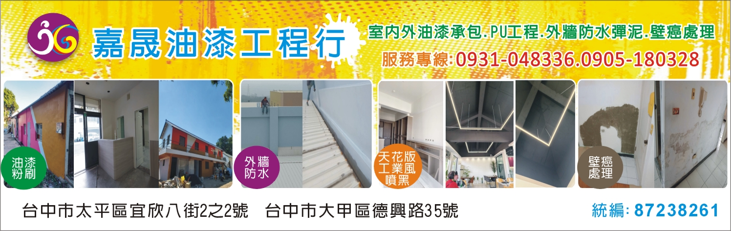 室內油漆、PU防水施作、壁癌處理、外牆防水彈泥、室內粉刷、民宅粉刷、店面噴漆、裝潢油漆、油漆工程承包、傢俱烤漆、鐵件烤漆、門板烤漆、陽台油漆、外牆油漆、牆面油漆、圍牆油漆、天花板油漆、房屋新建油漆、新房油漆、房屋油漆、套房油漆、豪宅油漆、樓梯油漆、裝潢場油漆、營造場油漆、居家油漆、各式油漆工程、台中油漆、台中室內外油漆粉刷、台中PU防水施作、台中頂樓防水、台中外牆防水、台中外牆油漆、台中外牆防水彈泥