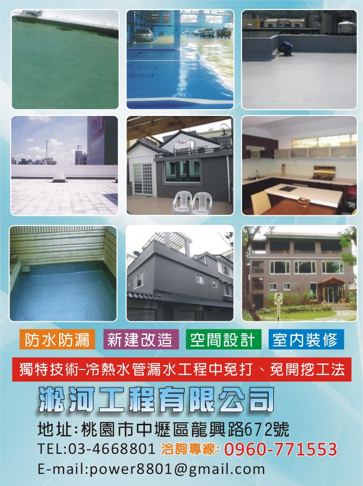 頂樓防水、防水防漏、室內裝修、房屋改建、屋頂防水、浴室防水、外牆防水、花台防水、防漏工程、隔熱工程、壁癌處理、鋁窗防水、地下室高低壓抓漏、蓄水池防水、污水池FRP、環氧樹脂EPOXY地坪工程、結構補強、高壓灌注、房屋拆除、垃圾清運、房屋新建、房屋改建、房屋修繕工程、矽利康塞水路工程、玻璃纖維防水(FRP)、連續壁高壓灌注工法、污水池環氧樹脂防水、防水材料、防水隔熱工程、頂樓防水、FRP花台防水、磁磚牆防水、浴室捉漏、灌注抓漏、防水抓漏、帷幕牆抓漏、鐵屋防水防銹工程、桃園防水工程、桃園頂樓防水、桃園室內裝修、桃園房屋改建、桃園防水抓漏、桃園外牆拉皮、桃園房屋修繕、桃園地坪工程、桃園壁癌處理、中壢防水工程、中壢頂樓防水、中壢室內裝修、中壢房屋改建、中壢防水抓漏、中壢外牆拉皮、中壢房屋修繕、中壢地坪工程、中壢壁癌處理