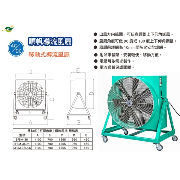 順帆AC/DC移動式/直接式-導流風扇SFBM-36DCN/原廠全新/高屏經銷商/高雄綠陽能源環保產品說明