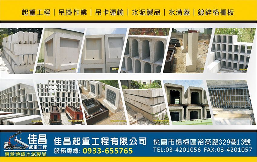 起重工程、吊卡運輸、吊掛作業、運送貨物、萬物承運、重物承運、鷹架承運、吊卡車、合格吊籃、大貨車、吊卡長短程日夜服務、運輸貨品、預鑄AB型U型溝、陰井、路緣石、水溝蓋、鍍鋅格柵板、化糞池、紐澤西護欄、水泥柱、水泥製品、鋼筋混凝土管、排水溝、百歲磚、連銷磚、空心磚、人行道磚、擋土牆、水泥板、刺線網圍籬、水泥管、水泥管基座、汙水化糞池、水箱、蓄水池、箱涵、楣樑、界石、GRC預鑄陰井、GRC預鑄U型溝、預鑄陰井、預鑄U型溝、各種鐵件施作、預鑄水泥製品、場鑄土木工程施作