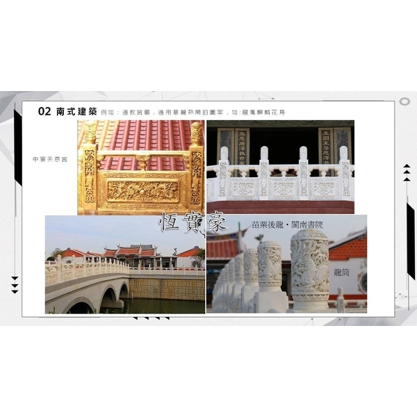 南式廟宇建築、北式廟宇建築、大型佛寺、個人宗祠、公共藝術、各種中式建築之裝置藝術。
