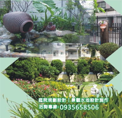 各種樹買賣詢價、工程施工承包代工、庭院規劃設計、廠區維護、栽植技術、病蟲害諮詢、景觀水池設計及施作、庭園景觀