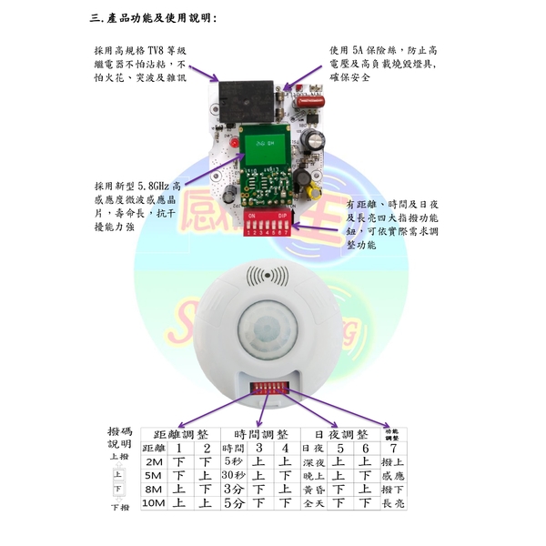 6.感應器為台灣製造,符合台灣全電壓且有距離、時間、日夜及長亮等四大功能調整功能鈕,