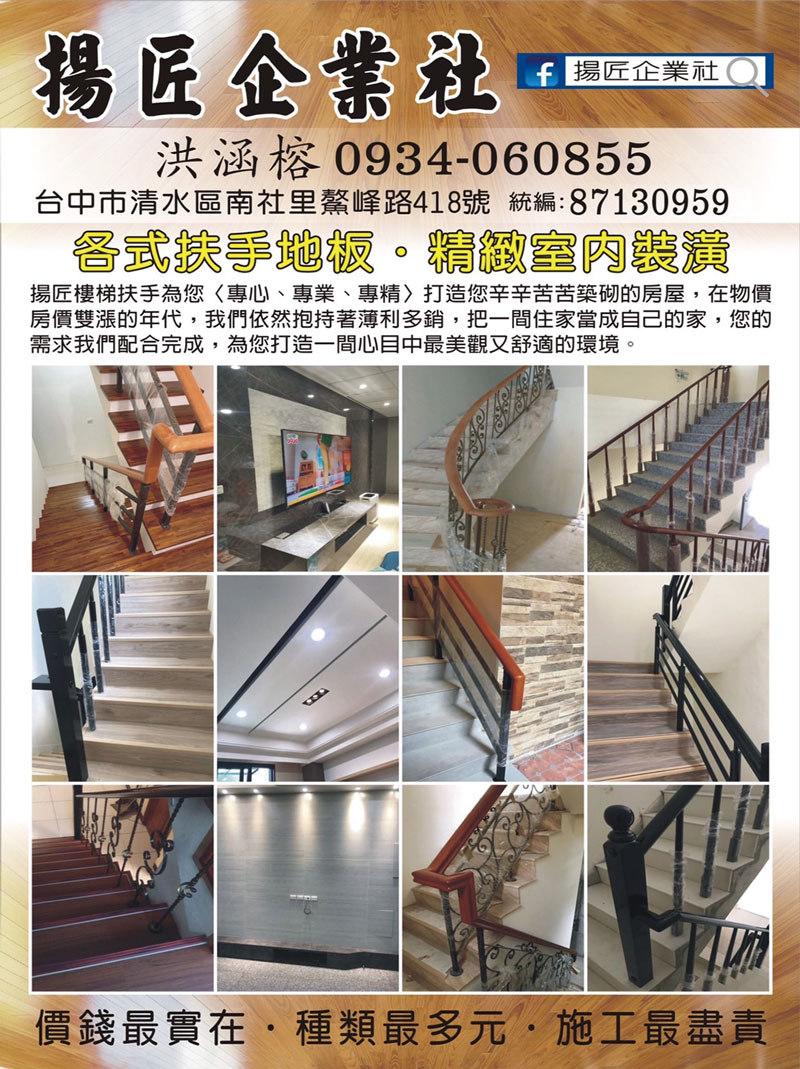 樓梯扶手、藝術鍛造扶手、室內裝潢、超耐磨木地板、台中扶手地板、日式風扁鐵扶手、花梨木扶手、非洲柚木扶手、實木扶手、柚木集成腳踏板、SPC石塑地板、超耐磨木地板、客製化精緻室內裝潢、無障礙空間扶手、藝術鍛鐵扶手、玻璃扶手、木製三度空間扶手、海線扶手、揚匠扶手地板