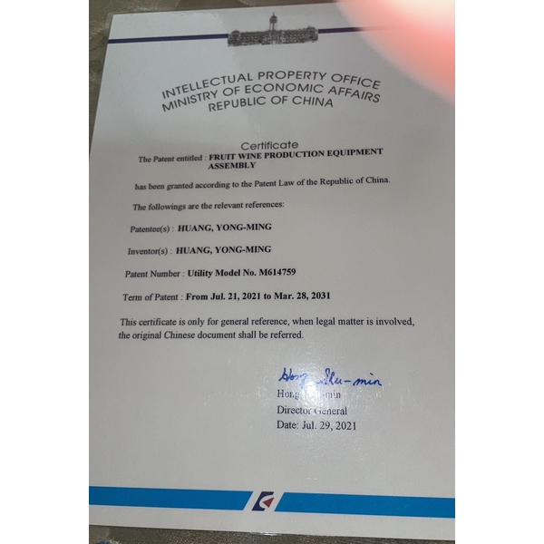 祥豪營造有限公司 - 水果酒之製作設備總成專利證書產品
