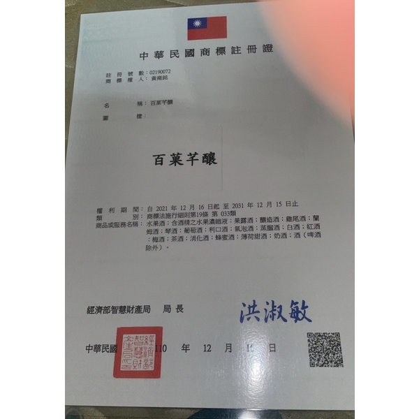 祥豪營造有限公司 - 百菓芊釀商標註冊證產品