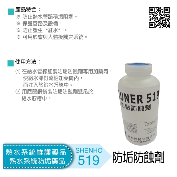 防垢防蝕劑是專門用來克服此類問題的最佳產品。同時在熱水系統內,由於經常會有短暫死水現象。我們素知,當水溫越高,它對鐵管的腐蝕具有加速作用,所以死水往往造成紅水的〝銹水〞。防垢防蝕劑的特殊配方,能完全有效防止此類紅水的產生。