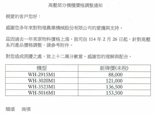 114年2月起 物理產品及零件己全面調漲,