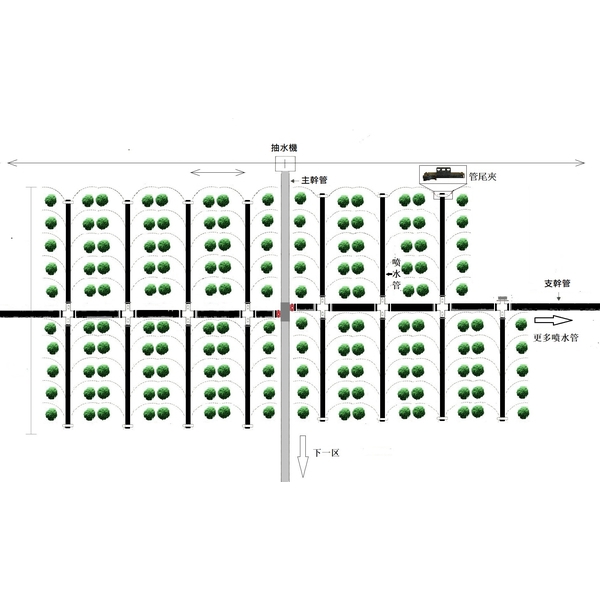 噴水管灌溉系統的水由抽水機抽出,進入主幹管。經由主幹管引導,分支進入支幹管。再由支幹管分支,讓水進入噴水管,以0.5kg/cm2左右的壓力噴灑。因為噴水管的操作壓力只需要0.5kg/cm2,所以支幹管只要能承受1kg/cm2左右的壓力,就能讓噴水管以0.5kg/cm2左右的壓力正常噴灑。福鹿牌PE可捲繞塑膠支幹管爆破壓力設計在1.5kg/cm2以上,支持噴水管噴灑有足夠的耐受壓力。管身採用耐曬抗紫外線的材料製成,使用壽命長,重量輕,易收捲,體積小,收放自如。佈建噴水管灌溉系統輕鬆快速,成本低廉。管徑由2”到4” ,配合大小農地,本公司都能提供相應的支幹管,歡迎選用。