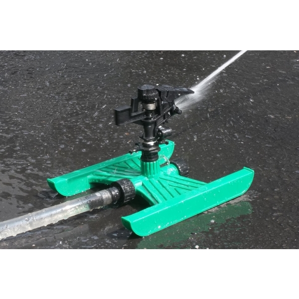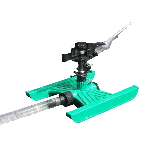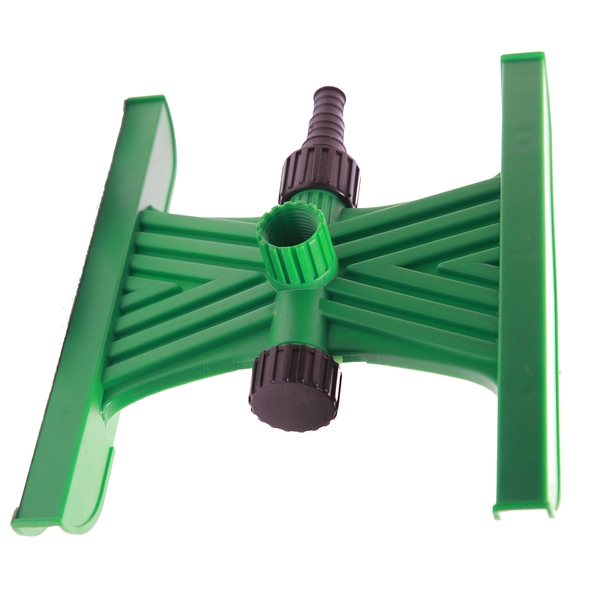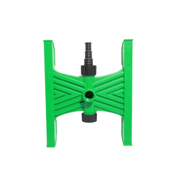 噴頭底座的重量較重,可以平穩放置,噴頭底座上面有一個朝上方的1/2"內螺牙,噴頭可旋緊固定在上面,底座旁邊有水管接頭,可接上供水的水管,噴頭底座的另一頭可裝上接頭,用來連接下一個噴頭底座,成為一串相連的噴頭組,最後一個噴頭底座可以裝上止水蓋止水