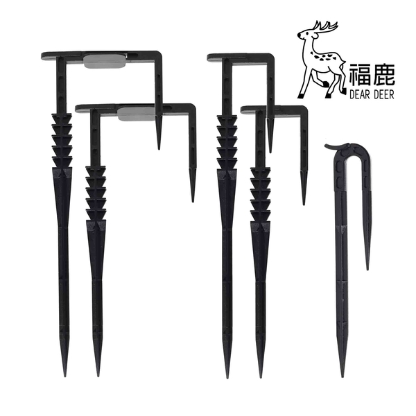 福鹿牌有3種類型的塑膠固定釘可插入土壤並將設施固定在地面上。