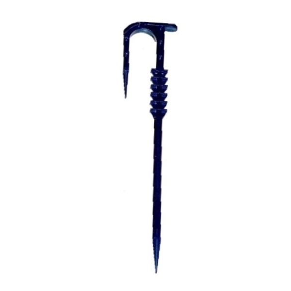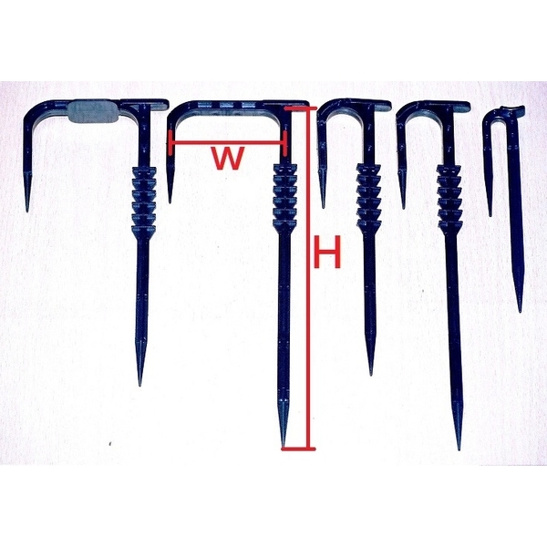 2. CJ-600 : T字形固定釘:這是有橢圓形頂板的固定釘。橢圓形頂板的長度(橢圓長軸)為13厘米,寬度(橢圓短軸)為5厘米。 釘身長度有3種,即10厘米,15厘米,20厘米。這型的固定釘的釘身比較粗大,並且可以用腳用力踩踏,來固定在地上。適用於較硬的農地。 很適用於雜草抑制蓆之類的農業設施的固定。