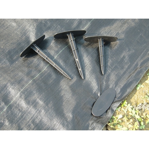 2. CJ-600 : T字形固定釘:這是有橢圓形頂板的固定釘。橢圓形頂板的長度(橢圓長軸)為13厘米,寬度(橢圓短軸)為5厘米。 釘身長度有3種,即10厘米,15厘米,20厘米。這型的固定釘的釘身比較粗大,並且可以用腳用力踩踏,來固定在地上。適用於較硬的農地。 很適用於雜草抑制蓆之類的農業設施的固定。