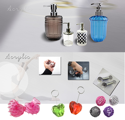 壓克力製品、壓克力漱口杯、壓克力啤酒杯、壓克力容器、壓克力商品、組合地墊、壓克力射出、壓克力球、工程塑膠、壓克力掛鉤頭、身體清潔用刷、按摩器、頭部按摩器、腳部按摩器、壓克力浴室用品、漱口杯、啤酒杯、壓克力杯、壓克力裝飾品、桌邊護角、乳液瓶、置物罐、抽屜把手、窗簾配件、衣架頭、裝飾頭、汽車改裝精品、衛浴精品、各種塑膠業開發射出製造