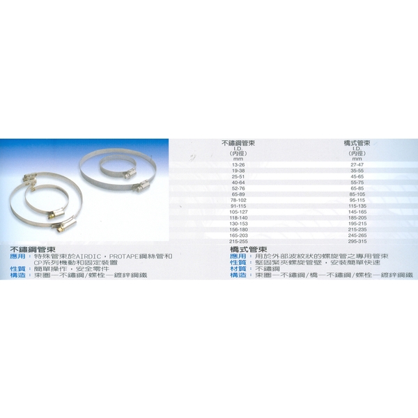 高壓管、耐油管、氧氣乙炔雙色管、氧氣乙炔單管、黃色氧氣乙炔雙併管、橡膠一、二層鋼絲管、訂做橡膠管、A級高壓管 、PVC蝦牌噴霧管、PVC沙泥管、伸縮管、進水管、PVC透明夾紗管、PVC透明管、萬可帶、PU管、 PU螺旋管、NYLON管、PE管、鐵弗龍管、透明PU可橈性風管、蒸氣管、PVC透明鋼絲管、紅龍管 、多用途吸入管、鐵弗龍軟管、矽膠管、矽膠耐溫風管、尼龍布風管、平面進水管、橡膠塑膠板類:黑色橡膠板、生膠板、耐油板、矽膠板、綠色橡膠板、雙色條紋板、圓粒橡膠、透明桌墊、防震圓墊、防震四方墊、海綿條、藍白帆布、PE棒、透明膠膜、白鐵管束、傳動皮帶