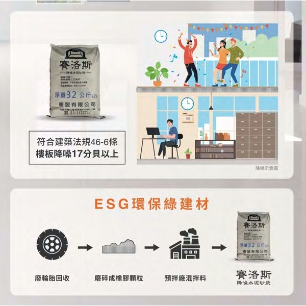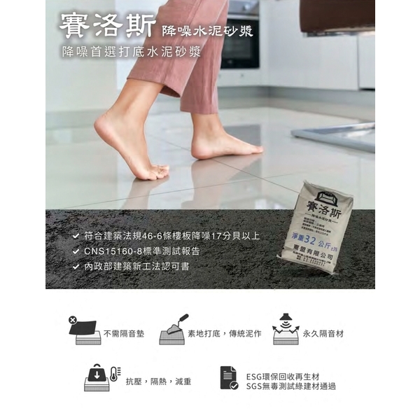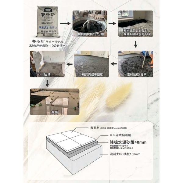 不需隔音墊、素地打底,傳統泥做、永久隔音材、抗壓,隔熱,減重