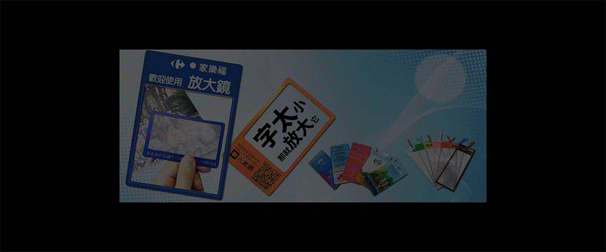 a. 超薄放大鏡款式: 名片全型、名片半型、書籤型、卡片型、閱讀型、軟磁書籤型、全彩紙卡放大鏡。