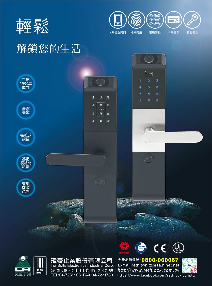 瑋豪企業股份有限公司-RETHLOCK- 成立於1990年,憑著生產工廠之生產優勢 研發生產電子卡片門鎖及安全門禁系統已30餘年經驗。1993年為因應市場需求而進行量產。致力於中美技術合作研發改良,為達人性化之需求,改造多種把手樣式,並加強外觀之處理。