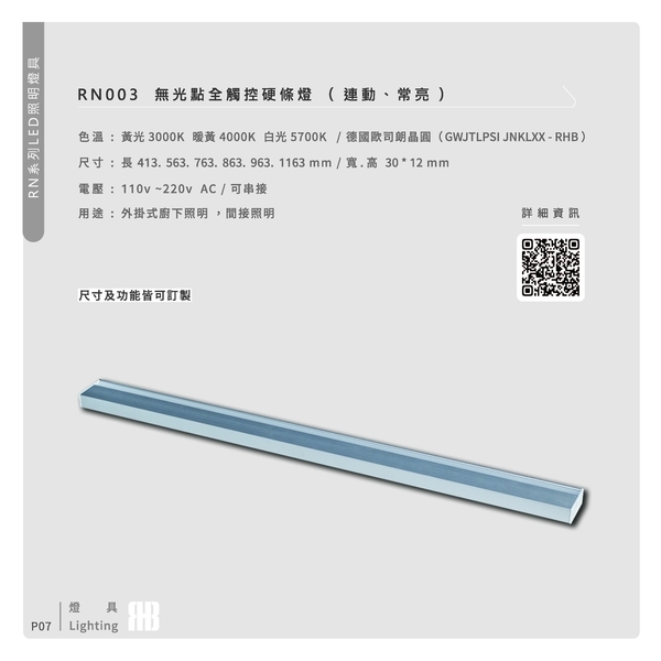 產品型號 RN003 無光點單點觸控硬條燈 (常亮) 專注於單點觸控,純粹穩定。