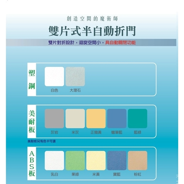 雙片式半自動折門,雙片對折設計,迴旋空間小,具自動關閉功能,材質:塑鋼