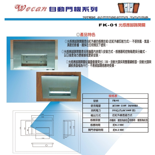使用日製感應主機,適用於醫療場所,手術室,不方便使用手開門處,腳踢感應即可開門。