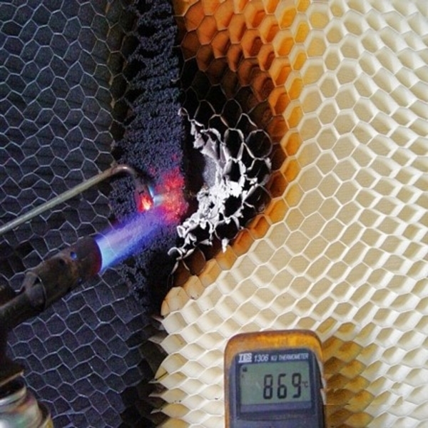 一般市售防焰紙蜂巢遇高溫時,化成灰燼;熱脹式蜂巢芯之膨脹石墨將蜂巢孔徑填滿阻止火勢蔓延。