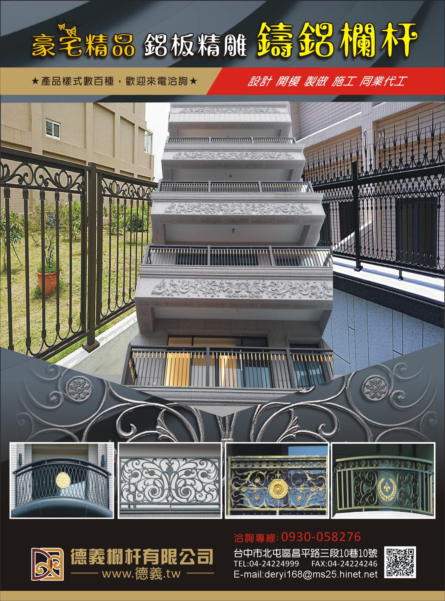 德義欄杆有限公司經營二十餘年來,專業於金屬藝術建材如鐵鑄品、鍛造產品及新型式的鋁鑄品等材質,再行加工組裝後就成國內到處可見的雕花牌樓、大門、住家小門、扶手、鐵窗、飾花、玄關門所用的門花、鋁板以及家家戶戶都需要的陽台欄杆等…,在在展現產品的多元化。