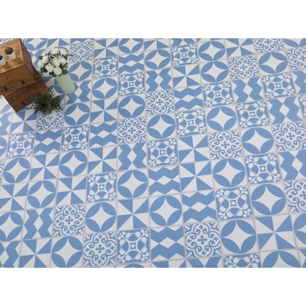 Green-Flor 的Tierra Nueva西班牙花磚系列,靈感來自於歐洲的南洋、民族風,其根本精神是不失空間自然原味與保有樸質本質。這也反映在我們的花紋設計上,以紅、藍、黑、白、灰為主色調,在地磚邊緣框,保留不規則的手工加工效果呈現出濃濃的手工感,邊緣帶有磨損、污痕設計、淡黃色的地磚底色,製造復古、自然風格的風格,呈現出地中海的室內設計特色,淡雅樸素且充滿戲劇張力,非常適用於對風格較講究的商空、辦公室,另外由於是仿磁磚效果,因此也適於居家廚房、玄關等區域。