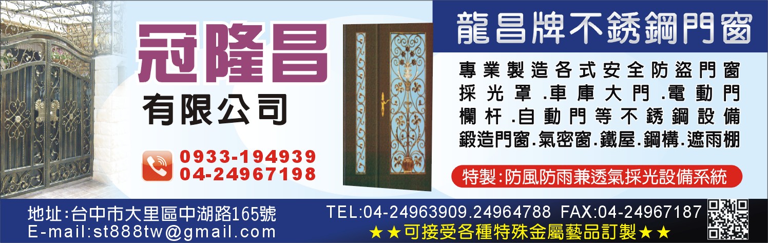 經營項目:龍昌牌不銹鋼門窗、不銹鋼門窗、不銹鋼防盜門窗、安全防盜門窗、採光罩、車庫大門、欄杆、電動門、自動門、鍛造門窗、氣密窗、鐵屋、鋼構、遮雨棚、雨庇、不銹鋼置物架、不銹鋼花架、鍛造藝術置物架、鍛造藝術大門、樓梯、爬梯、扶手、花棚架、伸縮大門、大門、置物架、特殊金屬藝品訂製...等。