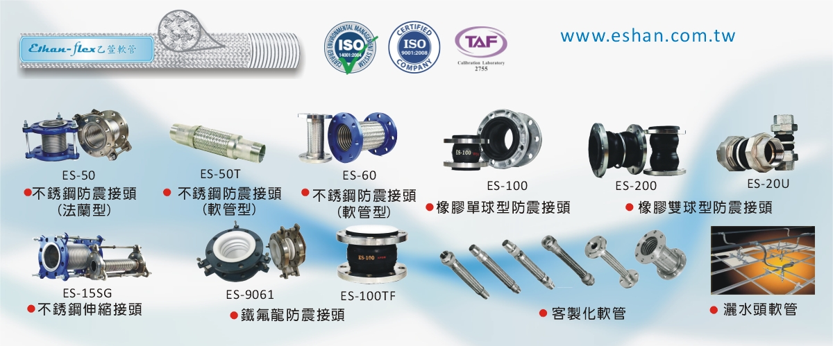 防震接頭、不銹鋼伸縮接頭、橡膠防震接頭、鐵氟龍軟管、客製軟管、灑水頭軟管、橡膠軟管、金屬軟管、伸縮囊、膨脹接頭、可撓管、蛇管、橡膠、通力、商佑、鵬宇、避震、三咸震、接頭、閥、凡而、管、法蘭、墊片、止漏、波紋管、泵浦、ESHAN、SUS、PTFE、TEFLONW、JF、ES、SF、PANEW、RUBBER、StainessSTEEL、Tube、pipe、pump、Fitting、FLANGE、乙萱、乙宣、橡膠軟管(法蘭型)、橡膠軟管ES-200、橡膠軟管ES-100、橡膠軟管ES-20U、不鏽鋼胴體、方型伸縮接頭、伸縮接頭(附外筒)、伸縮接頭ES-40SG、伸縮接頭ES-15SG、橫向接頭、伸縮接頭(牙口型)、伸縮接頭(壓接型)、防震接頭ES-50、ES-50H、防爆軟管、軟管(由令型)、軟管(被覆橡膠)、軟管(SN立布)、軟管(SM型)、水電空調、新北水電空調、新北橡膠軟管、水電空調用接頭、水電空調用管路