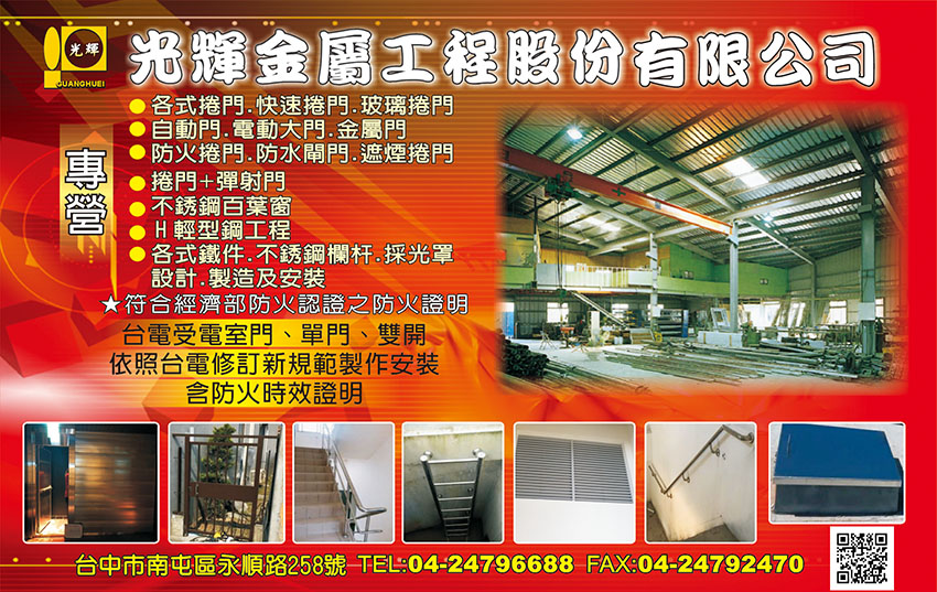 捲門、快速捲門、玻璃捲門、防火捲門、自動門、電動大門、防水閘門、遮煙捲門、H輕型鋼工程、造型鐵件、不銹鋼欄杆、防火捲門金屬門、台電受電室門、單門、雙開門、彈射門、金屬門、電動伸縮大門、不銹鋼爬梯、不銹鋼爬梯人孔蓋、採光罩、鐵絲網圍籬、不銹鋼窗、造型雨遮、不銹鋼藝術造型、不銹鋼扶手、捲門、閘門、防火門、不銹鋼門、阻熱性防火布捲門、60A阻熱性捲門、台中捲門、台中防火捲門、台中金屬門、台中自動門、台中玻璃捲門、台中防水閘門、台中遮煙捲門、台中造型鐵件、H輕型鋼工程、採光罩設計安裝