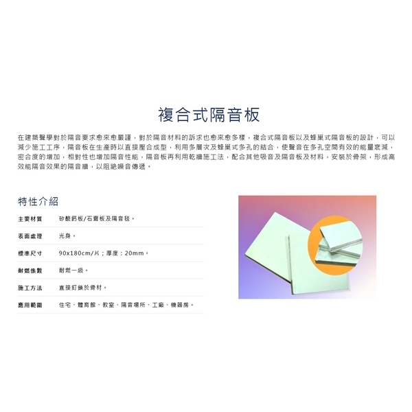 在建築聲學對於隔音要求愈來愈嚴謹,對於隔音材料的訴求也愈來愈多樣,複合式隔音板以及蜂巢式隔音板的設計,可以減少施工工序,隔音板在生產時以直接壓合成型,利用多層次及蜂巢式多孔的結合,使聲音在多孔空間有效的能量衺減,密合度的增加,相對性也增加隔音性能