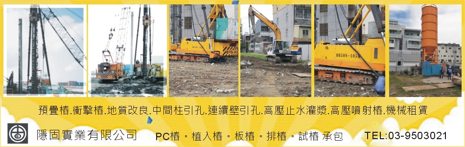 經營項目:PC樁、板樁、砂樁、植入樁、試樁、排樁、預疊樁、沖擊樁、地質改良、中間柱引孔、連續壁引孔、高壓止水灌漿、高壓噴射樁、機械租賃、承包、PC樁打設、鋼管樁打設、擋土排樁、鑽堀樁、地質改良、水泥製品