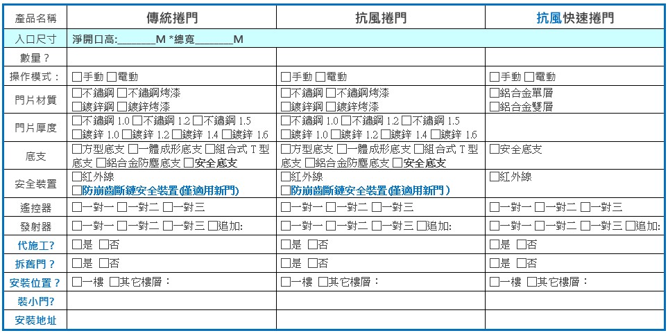 - 快速捲門:主要用於工廠或物流中心,強調快速啟閉。(標配:抗風風鉤輪裝置)