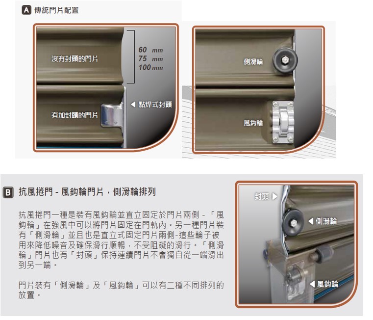 - 通過加裝風鉤輪,可升級為抗風防颱鐵捲門