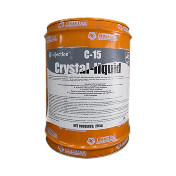 C-15 結晶水是一款高滲透性矽酸鹽防水材料,能深入水泥結構5mm以上並形成穩固保護層。具有卓越耐候性、耐鹼性、不受紫外線及溫差影響,能有效阻隔水氣滲透,達到100%防水功能,適用於鋼筋混凝土、水泥及磚塊等結構防水處理。