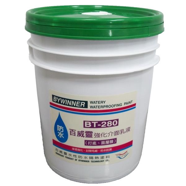 百威靈BT-280防水漆是本公司強烈推薦您使用的「高品質」防水底漆,它強力的滲透性能迅速的填補您建築結構裡的裂紋與細縫,形成一道有效的超級防水層,讓你不再為漏水苦腦。BT-280特性有抗拉、抗裂、抗酸鹼並且耐水解,讓您不用擔心環境與氣侯長時間的交互侵蝕所帶來的影響。重點是它可以承受氣溫的強烈變化!不同於一般防水漆在經過冷、熱交替後,容易帶來硬化與變質導致於漏水的現象,是防水工程中「打底」與強化介面的最佳幫手!