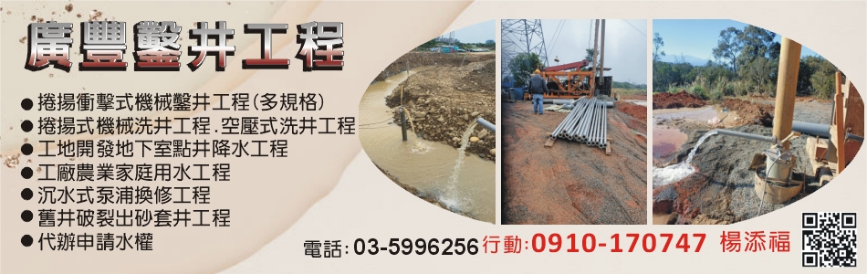 服務項目:捲揚衝擊式機械鑿井工程(多規格)、捲揚式機械洗井工程、空壓式洗井工程、工地開發地下室點井降水工程、工廠農業家庭用水工程、沉水式泵浦換修工程、舊井破裂出砂套井工程、代辦申請水權