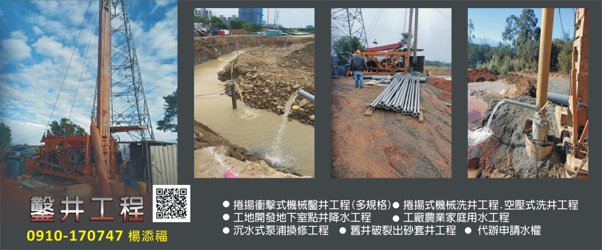 多規格捲揚衝擊式機械鑿井工程、多規格捲揚式機械洗井工程、空壓式洗井工程、工地開發地下室點井降水工程、工廠農業家庭用水工程、沉水式泵浦換修工程、舊井破裂出砂套井工程、代辦申請水權、鑿井工程、洗井工程、點井降水工程、工廠鑿井、農業鑿井、家庭鑿井、鑿井安裝泵浦、泵浦換修、套井工程、鑿井抽水實驗