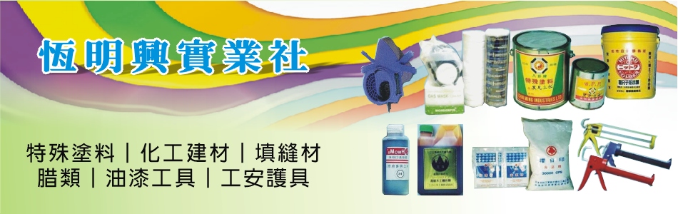 營業項目:防水材料、特殊塗料、化工建材、填縫材、腊類、油漆工具、工安護具、單液耐熱超亮型優麗旦、閃光金粉、閃光白粉、螢光漆、去漆劑、佛青、礦彩顏料、金粉、銀粉、x-2洗石金油、日特急結防水劑、防水膠、防水粉、海菜粉、高分子彈泥、撥水劑、水性防水材、水泥強化劑、水泥灌注槍、八卦石棉膠、黑凡立水...等。