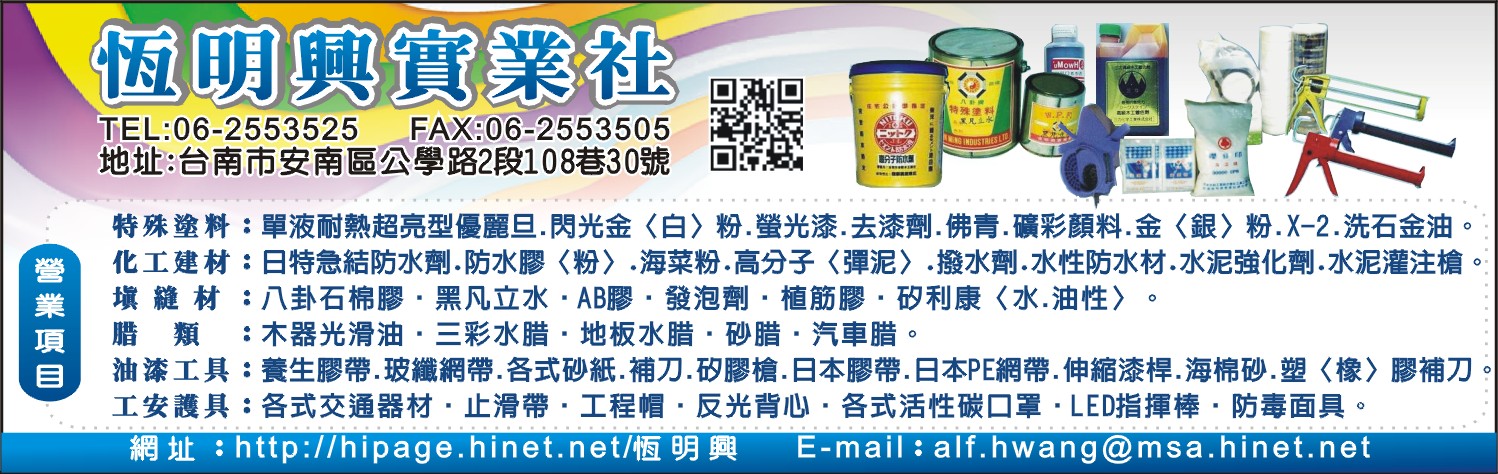 營業項目:防水材料、特殊塗料、化工建材、填縫材、腊類、油漆工具、工安護具、單液耐熱超亮型優麗旦、閃光金粉、閃光白粉、螢光漆、去漆劑、佛青、礦彩顏料、金粉、銀粉、x-2洗石金油、日特急結防水劑、防水膠、防水粉、海菜粉、高分子彈泥、撥水劑、水性防水材、水泥強化劑、水泥灌注槍、八卦石棉膠、黑凡立水...等。