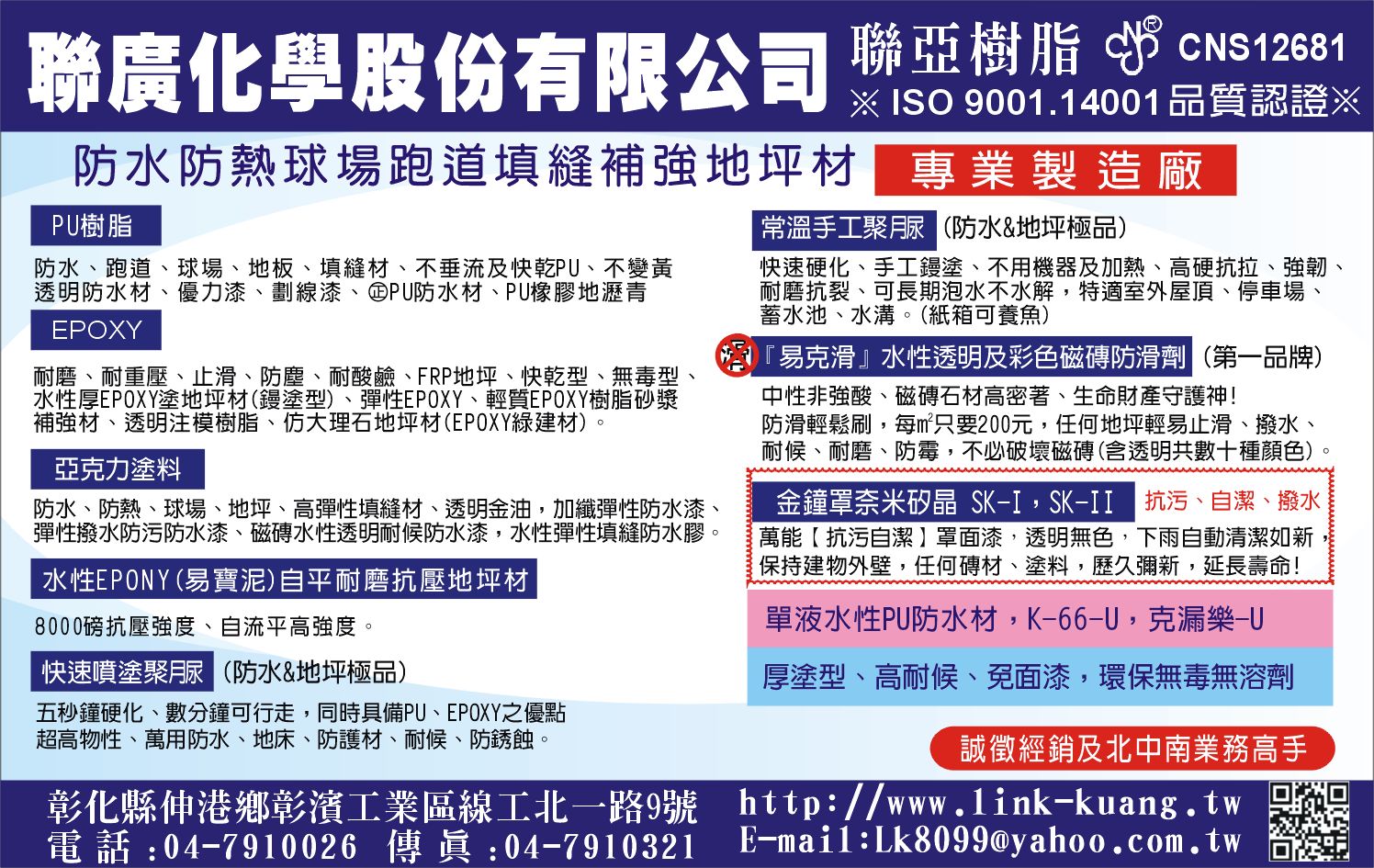 聯廣化學股份有限公司建立了嚴密的品管制度與廠務管理,通過了中央標準局一連串嚴苛的評鑑,所有產品達國家標準(CNS)以上,成為ISO 9001國際認證合格廠商,使品質獲得更完美的保證。今後將在技術上與品質上不斷的精進,為全民運動舖下最佳的場地,為建築市場提供最好的材料,並以高效率的售後服務,創造更美好的明天。
