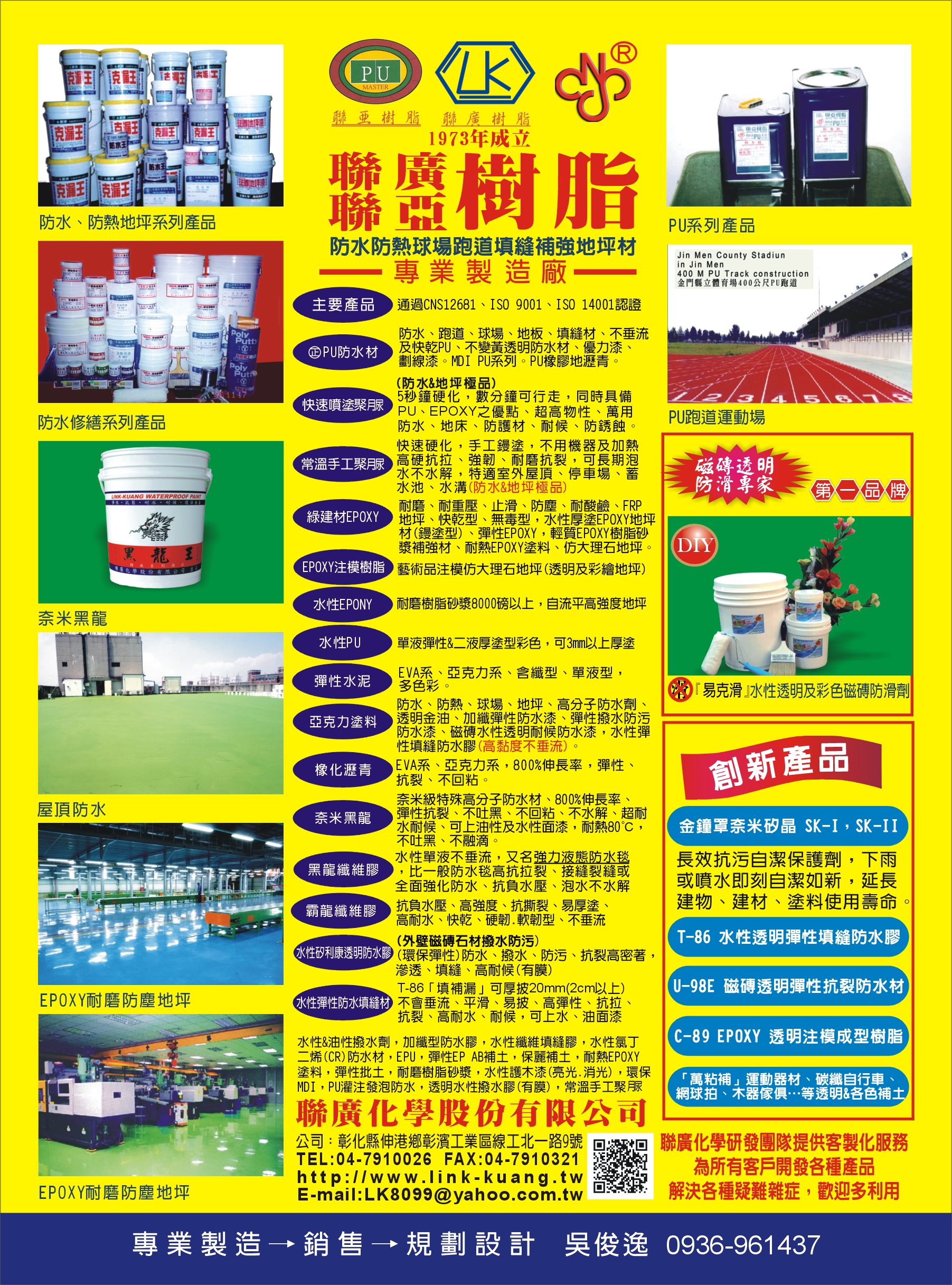 聯廣化學製造防水、防熱、球場、跑道、地坪、填縫、灌注補強、修補…等營建化工建材最專業之化工廠,歡迎建築師及公家機關設計採用~