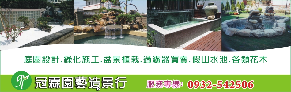 本公司專業於庭園設計、綠化施工、盆景植栽、過濾器買賣、假山水池、各類花木、各類大型盆栽與風格獨特庭木,各種特殊風韻之成品、半成品買賣。竭誠歡迎,蒞臨指導。