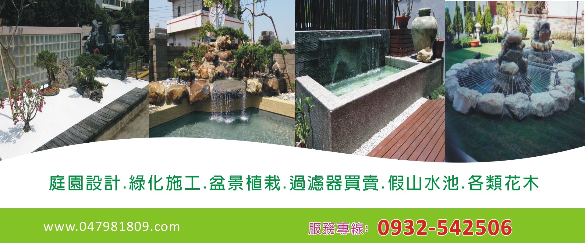 專業於庭園設計、綠化施工、盆景植栽、過濾器買賣、假山水池、各類花木...等,歡迎來電由專人為您服務!