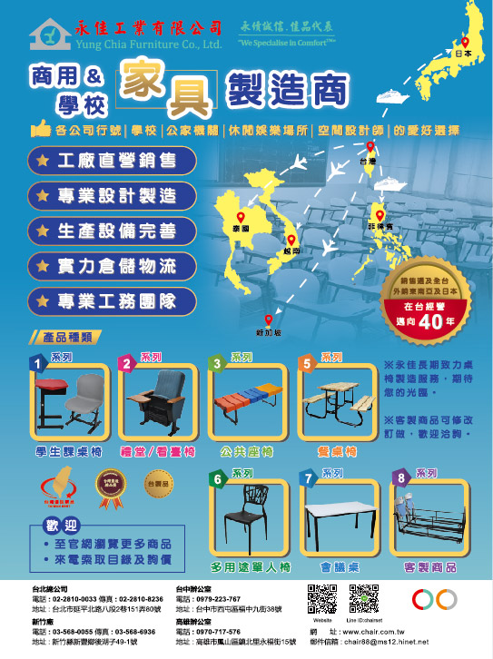 本公司早期專門生產製造金屬加工製品 及 玻璃纖維餐桌椅 和 公共排椅為主,日後為了滿足各領域客戶的需求,依序又設計及開發學生課桌椅、禮堂視聽椅、看臺椅、會議桌,甚至包含工業風家具以及客製化金屬製品。
